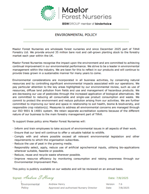 Maelor Forest Nurseries are wholesale forest nurseries and since December 2025 part of Tilhill Forestry Ltd. We provide around 35 million bare root and cell-grown planting stock to the forestry market each year within the UK.